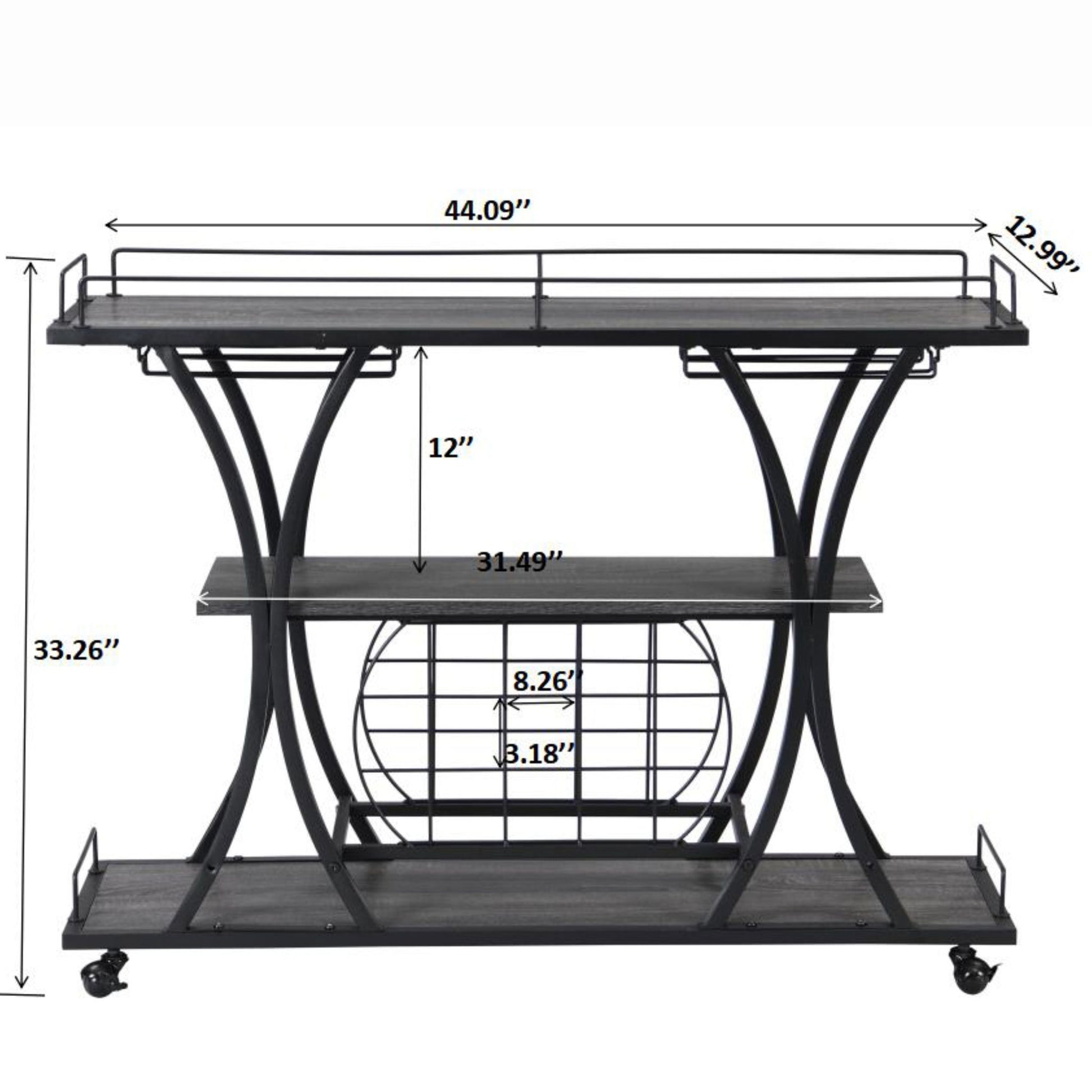 Industrial Bar Cart Kitchen Bar & Serving Cart For Home With Wheels 3 Tier Storage Shelves - Black / Gray