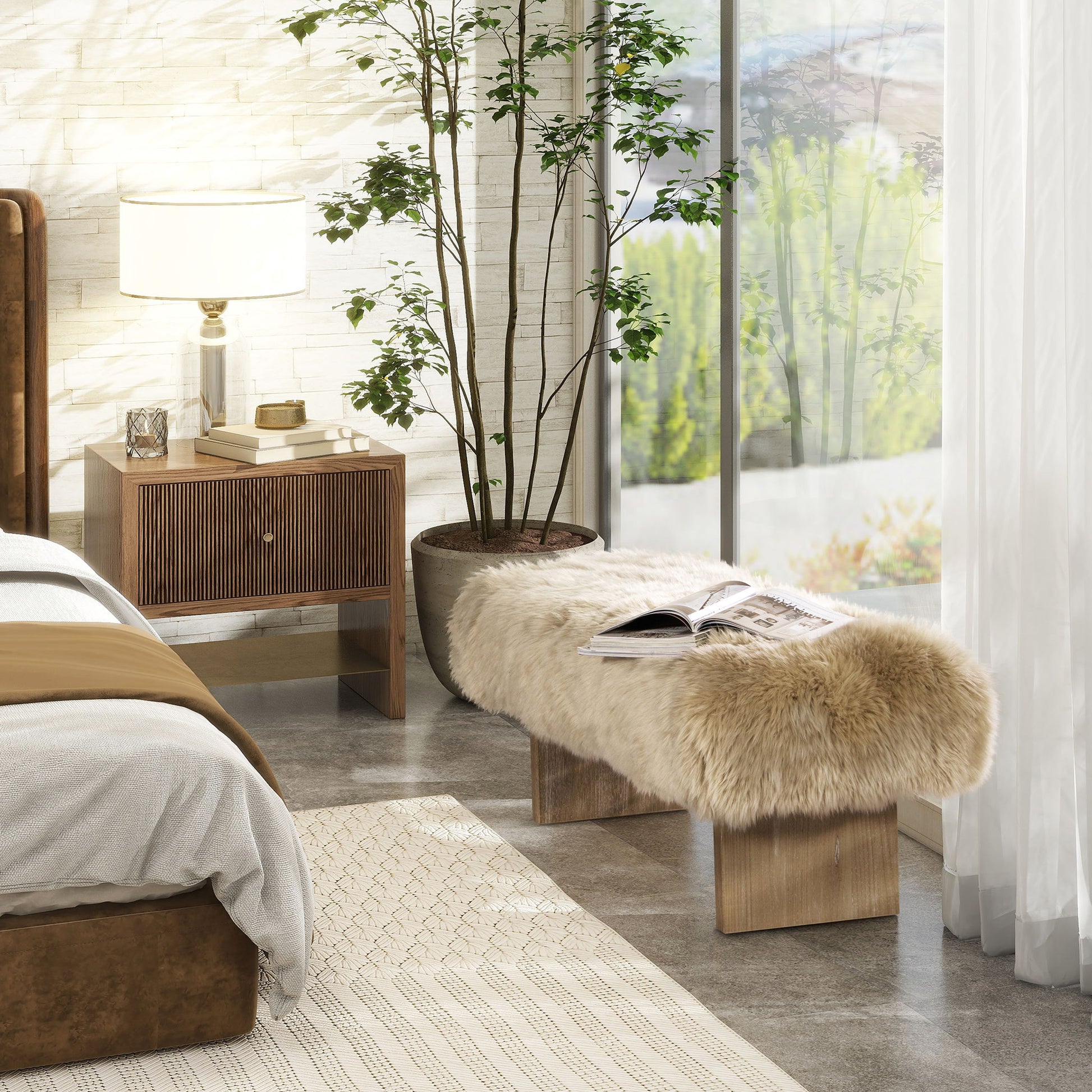Leda - Sheepskin Fur Rectangular Accent Bench - Natural Blonde